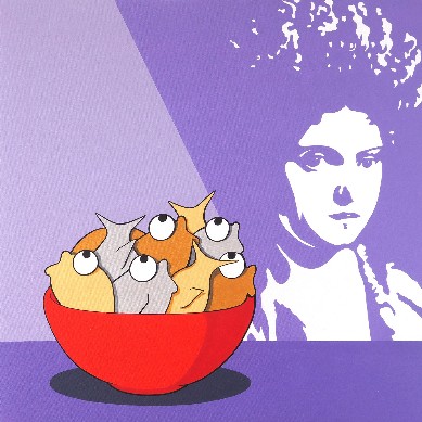 Formatosi inizialmente in ambito grafico, da subito Sangalli si è imposto grazie ad una cifra stilistica originale ed espressiva. La formazione e la specializzazione professionale sono diventare inevitabilmente materia di riflessione per la realizzazione delle sue opere, caratteristiche contraddistinte da uno sguardo ironico, ma non per questo banale, sul mondo. Le sue opere presenti anche in questa esperienza espositiva mantovana, hanno come protagonisti oggetti personaggi e situazioni che sono evidenti metafore dell’essere e ancor prima del vissuto come nel caso della figura di Isabella d’Este Gonzaga. Immancabile ironia, sale della vita per Sangalli, è garantita dallo straniamento dato dalle sequenze dei soggetti, tra cui gli ormai celebri pesci. I titoli delle sue opere guidano l’osservatore alla comprensione immediata del concetto che l’artista ha voluto dare all’opera, questo perché Andrea vuole stabilire da subito un contatto immediato sul filo sottile della condivisione con l’osservatore.